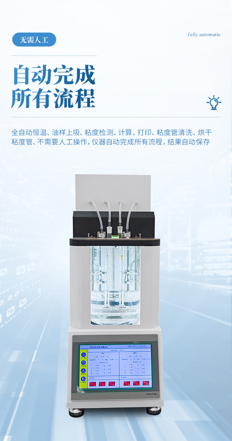 6.全自動(dòng)恒溫、油樣上吸、粘度檢測(cè)、計(jì)算、打印、粘度管清洗、烘干粘度管、不需要人工操作,儀器自動(dòng)完成所有流程,結(jié)果自動(dòng)保存。