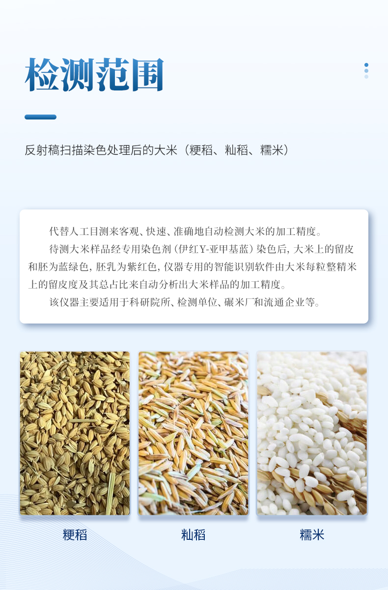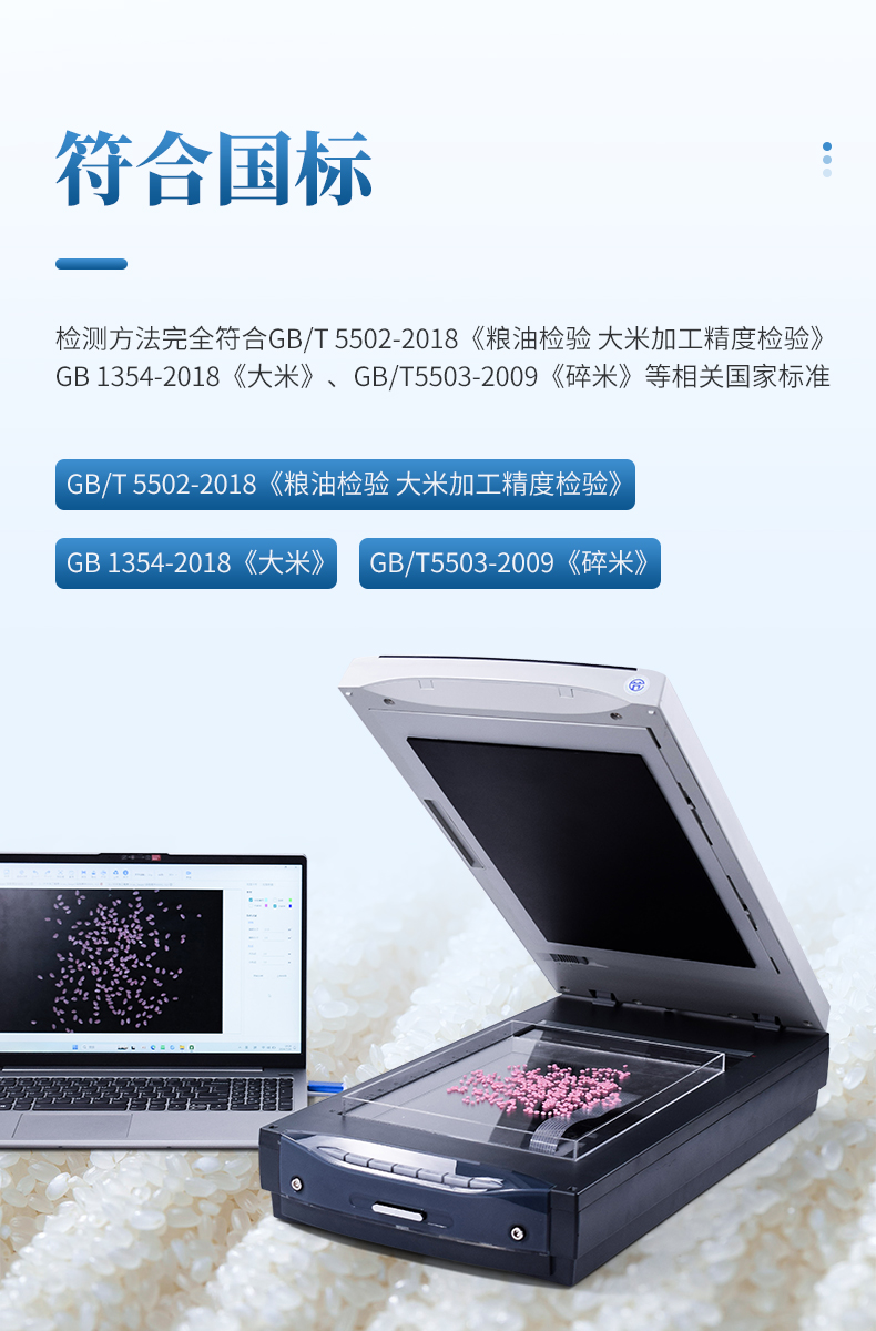 3、檢測方法完全符合GB/T 5502-2018《糧油檢驗 大米加工精度檢驗》、GB 1354-2018《大米》、GB/T5503-2009《碎米》等相關(guān)國家標(biāo)準(zhǔn)。