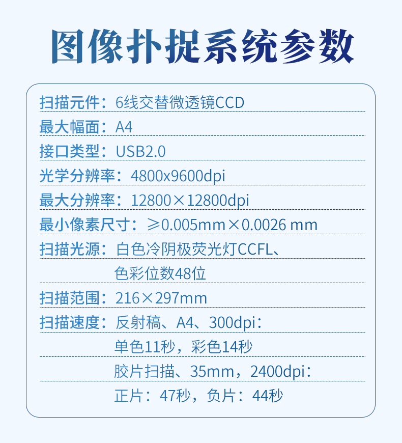 1、配光學(xué)分辨率4800×9600、A4加長的雙光源彩色掃描儀。反射稿幅面為355.6mm×215.9mm,透掃幅面為320.0mm×203.2mm,最小像素尺寸0.005mm×0.0026 mm。