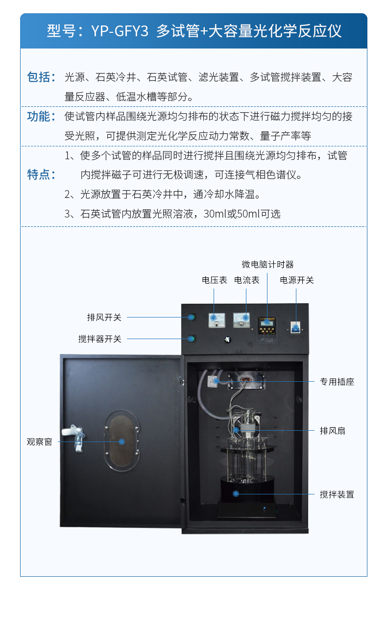 1.光化學(xué)反應(yīng)儀智能微電腦控制,可觀察電流和電壓實(shí)時變化