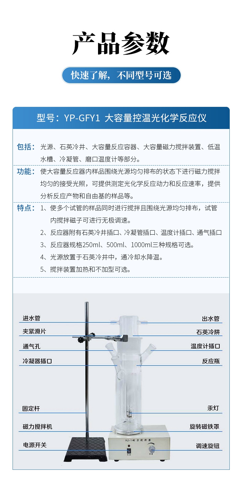 | 包括:光源、石英冷井、大容量反應(yīng)容器、大容量磁力攪拌裝置、低溫水槽、冷凝管、磨口溫度計等部分。 功能:使大容量反應(yīng)器內(nèi)樣品圍繞光源均勻排布的狀態(tài)下進(jìn)行磁力攪拌均勻的接受光照,可提供測定光化學(xué)反應(yīng)動力和反應(yīng)速率,提供分析反應(yīng)產(chǎn)物和自由基的樣品等。 特點(diǎn):1、使多個試管的樣品同時進(jìn)行攪拌且圍繞光源均勻排布,試管內(nèi)攪拌磁子可進(jìn)行無極調(diào)速。 2、反應(yīng)器附有石英冷井插口、冷凝管插口、溫度計插口、通氣插口 3、反應(yīng)器規(guī)格250ml、500ml、1000ml三種規(guī)格可選。 4、光源放置于石英冷井中,通冷卻水降溫。 5、攪拌裝置加熱和不加型可選。 |
