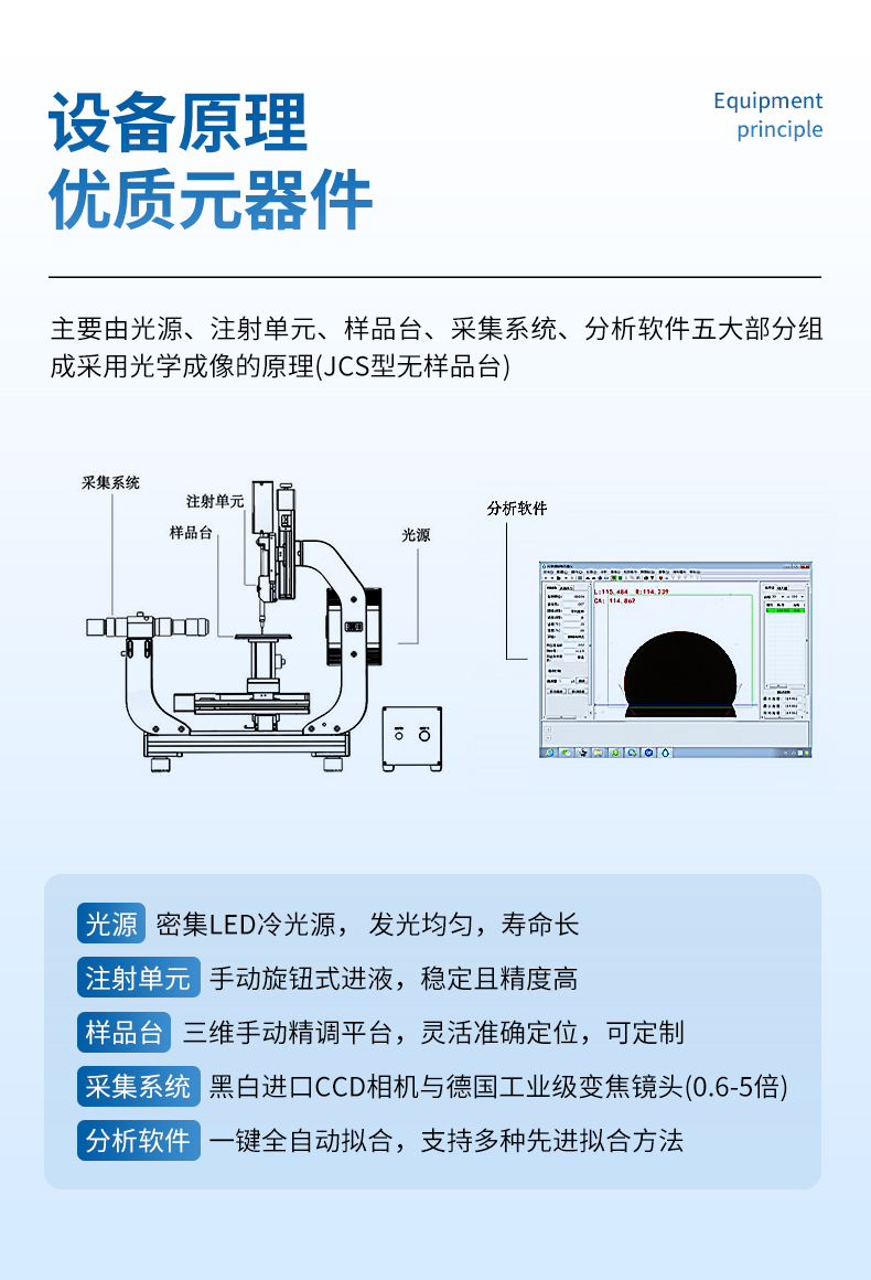 | 擬合方法 | 寬高法、圓擬合法、橢圓擬合法、多項式擬合法、Young-Laplace擬合法、ADSA-NA擬合法 | |