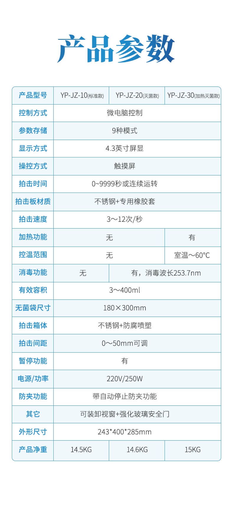 3. 均質(zhì)時間、拍打速度可調(diào)。