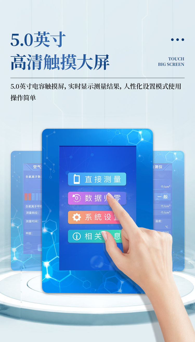 1、屏幕顯示:5.0英寸電容觸摸屏,800*480高分辨率,實(shí)時(shí)顯示負(fù)(氧)離子測(cè)量結(jié)果;