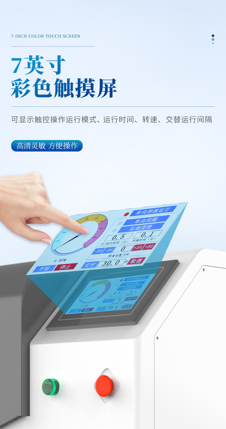 顯示方式:7.0寸彩色液晶顯示屏,可顯示、觸控操作運行模式、運行時間、轉(zhuǎn)速、交替運行間隔
