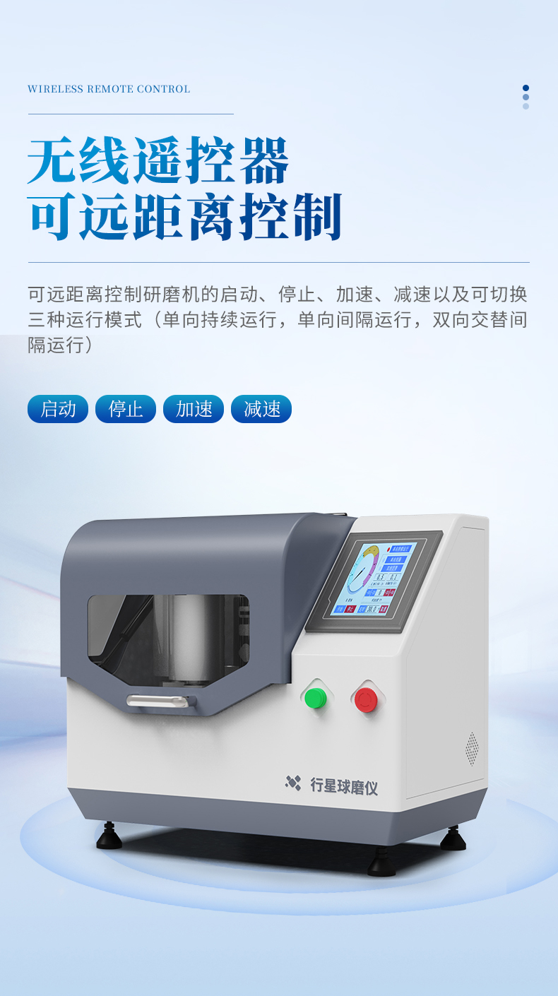 遠程遙控:標配無線遙控器,可遠距離控制研磨機的啟動、停止、加速、減速以及可切換三種運行模式(單向持續(xù)運行,單向間隔運行,雙向交替間隔運行)