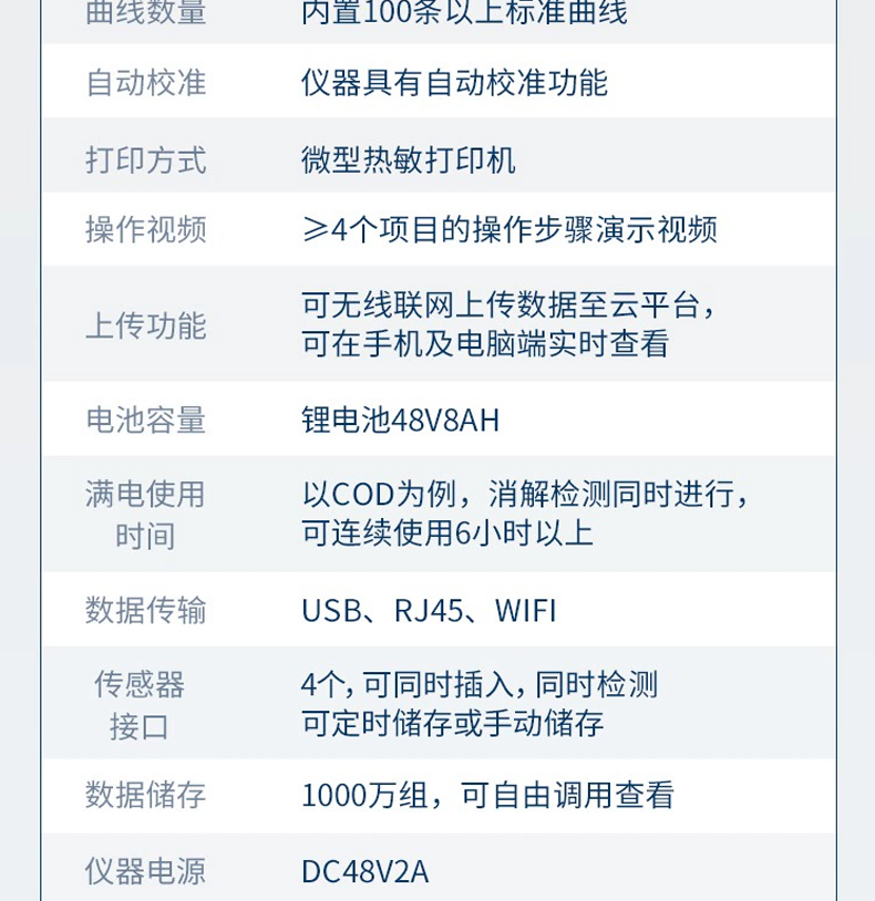 滿電使用時(shí)間:以COD為例,消解檢測同時(shí)進(jìn)行,可連續(xù)使用6小時(shí)以上;