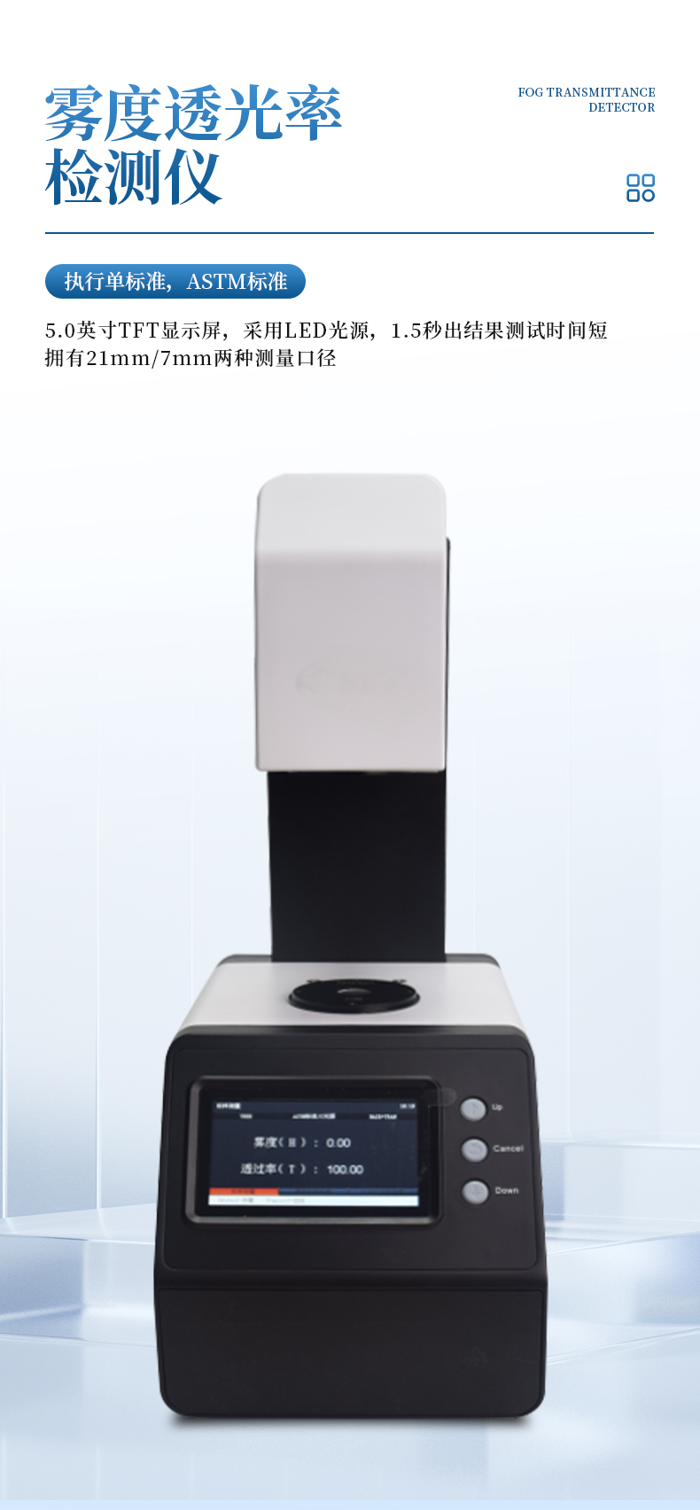 霧度透光率綜合儀是一款采用ASTM標(biāo)準(zhǔn),雙口徑(21mm/7mm)適用于測定塑料、薄膜、玻璃、LCD面板、觸摸屏等透明、半透明平行平面材料的霧度、總透光率的儀器。測試樣品有,AG玻璃,眼鏡,手機(jī)蓋板,手機(jī)殼,薄膜,燈罩等, 廣泛應(yīng)用于實(shí)驗(yàn)室、工廠、或現(xiàn)場操作,足以在幾乎所有應(yīng)用領(lǐng)域的質(zhì)量控制中實(shí)現(xiàn)最佳的霧度測量。
